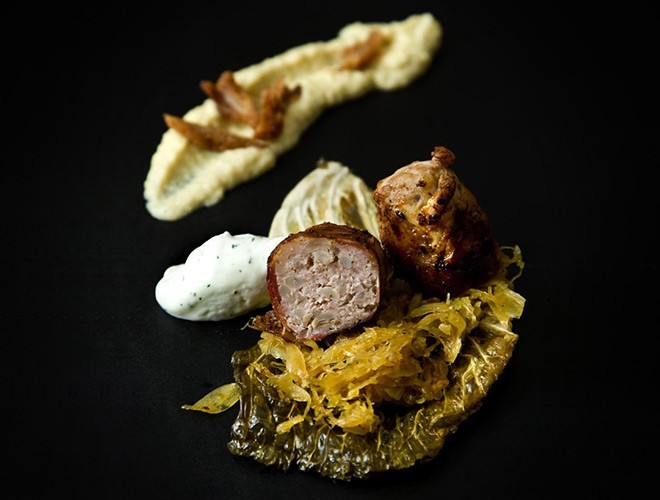 A cukrot óvatosan felolvasztjuk, rátesszük a káposzta felét, majd 2,5 dl húsalaplével folyamatos kevergetés közben puhára pároljuk. A káposzta másik felét 5 dl alaplével megfőzzük. Még melegen szétturmixoljuk. A finomra vágott vöröshagymát üvegesre pároljuk, hozzáadjuk az árpagyöngyöt, sóval, borssal ízesítjük, és a maradék húsalaplével kb. 20 perc alatt készre főzzük. A darált húst összekeverjük az elkészített árpagyönggyel, és a kiterített sertéshálóra helyezzük. Óvatosan feltekerjük, majd kívülről a szeletelt szalonnába tekerjük. Meleg serpenyőben minden oldalát körbesütjük, majd 160 °-os sütőben 8-10 perc alatt megsütjük. A négy legszebb káposztalevelet forró serpenyőben megpirítjuk. A zsírszalonnából töpörtyűt készítünk. Tálaláskor a sült káposztalevélre helyezzük a megpárolt káposztát, és mellétesszük a háromba vágott sertéshúst. Evőkanállal megformázzuk a savanyú káposztakrémet, melyre frissen készített töpörtyűt szórunk rá.